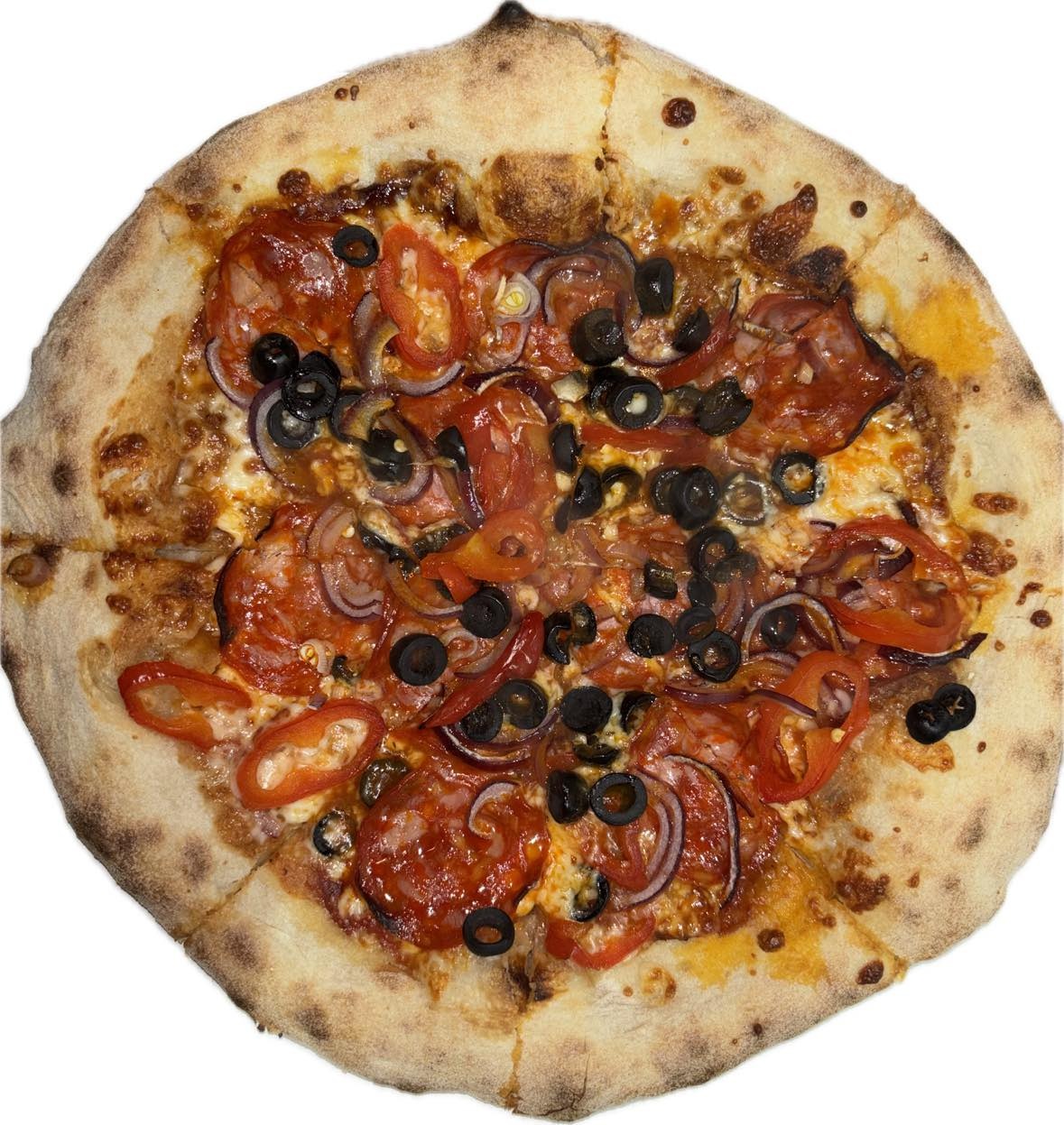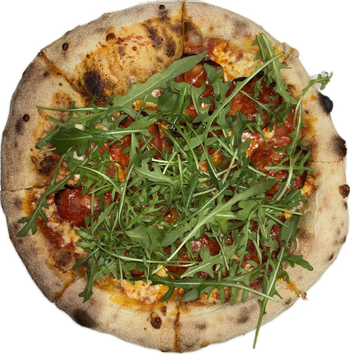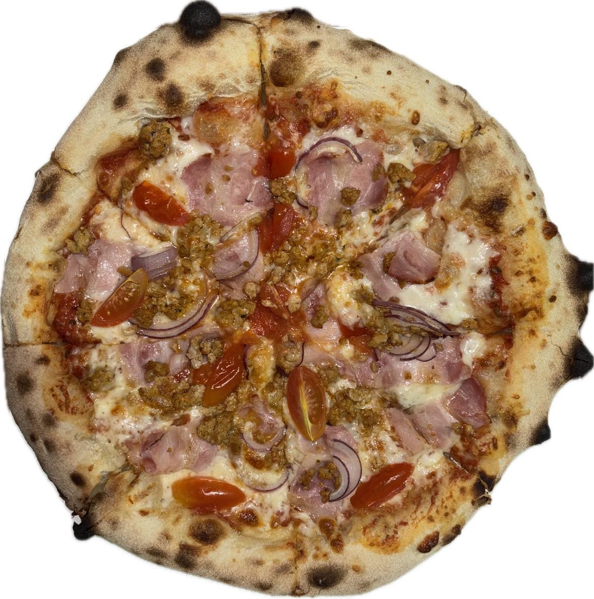 Sos pomidorowy, ser mozzarella, boczek, cebula czerwona, jalapeno, oregano