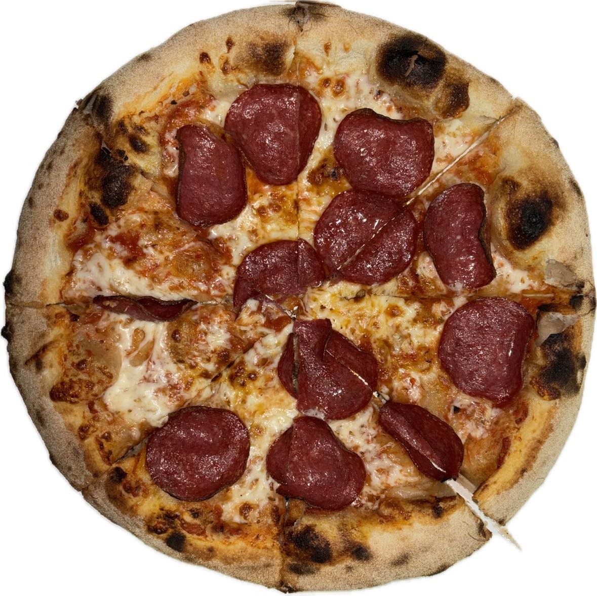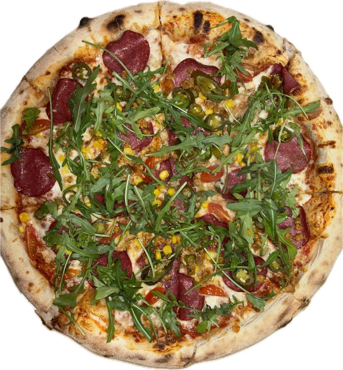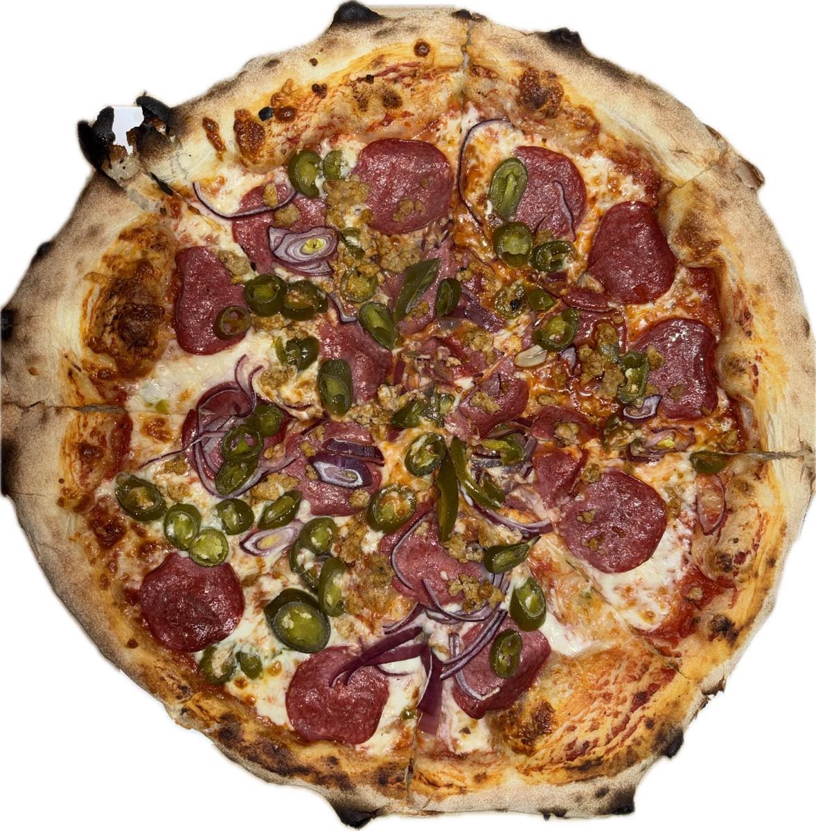 Sos pomidorowy, ser mozzarella, boczek, cebula czerwona, jalapeno, oregano