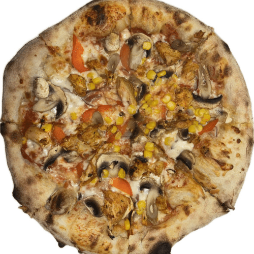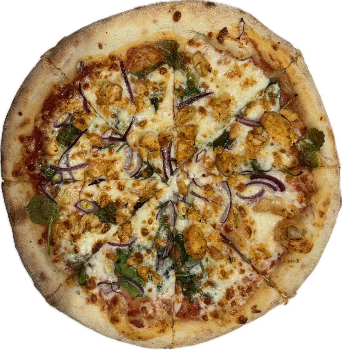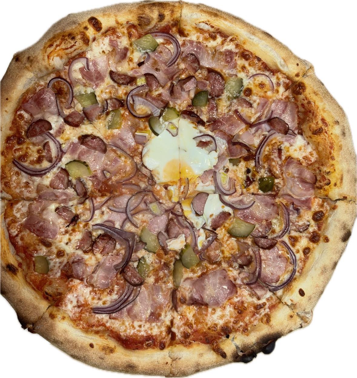 Sos BBQ, mozzarella, kurczak , bekon wędzony, kukurydza, cebula prażona -