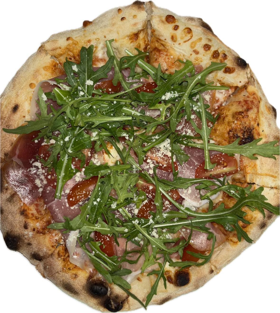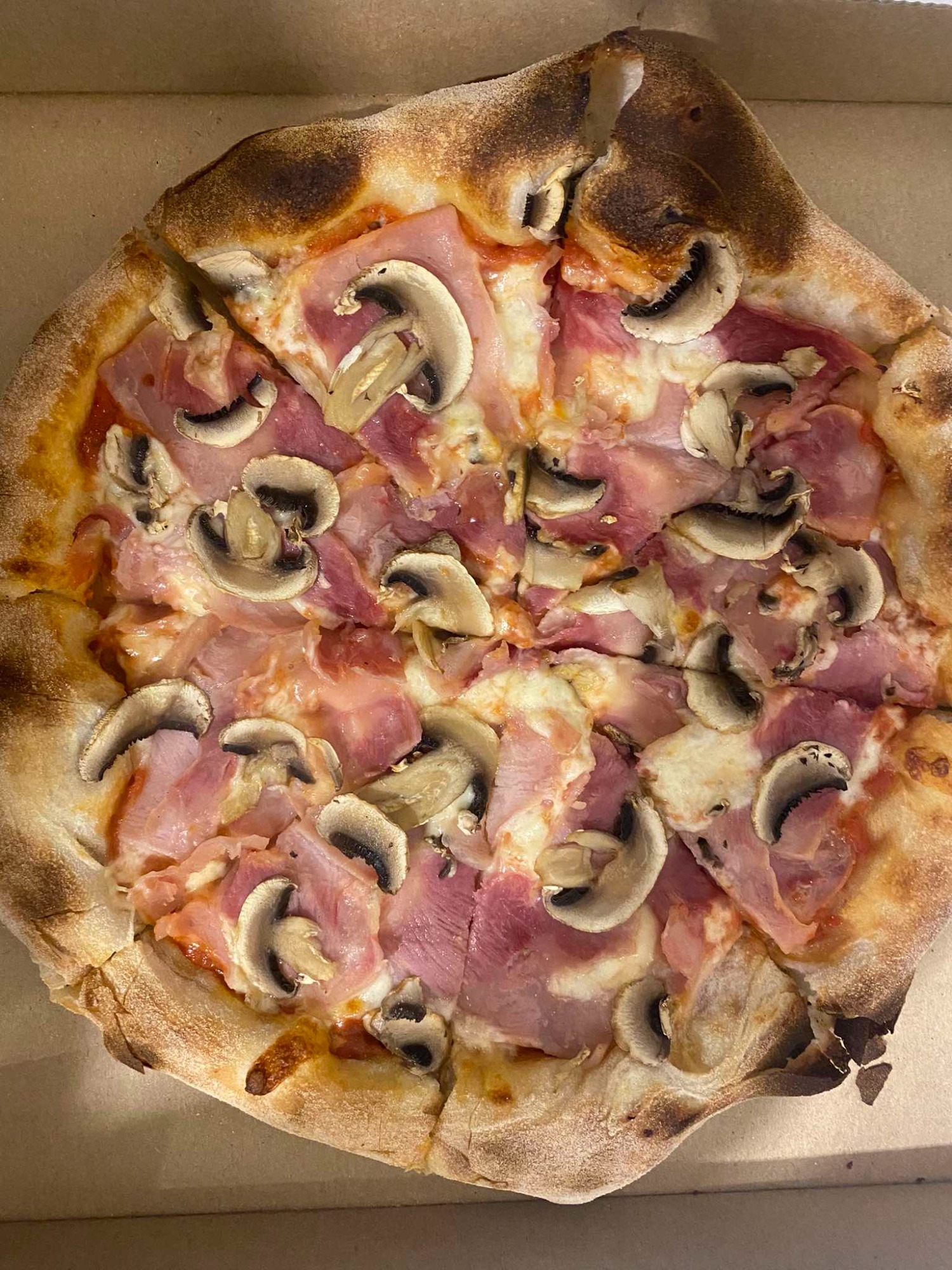 Sos pomidorowy (bazowy), Szynka Parmeńska, Grzyby Leśne, Cebula, ser mozzarella galbani