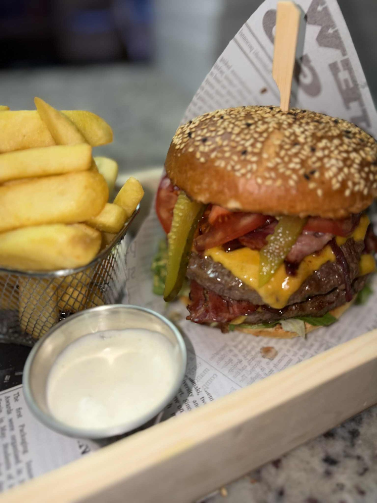 Sos pomidorowy, mozzarella, wołowina mielona, ogórek kiszony, pomidor, cebulka -