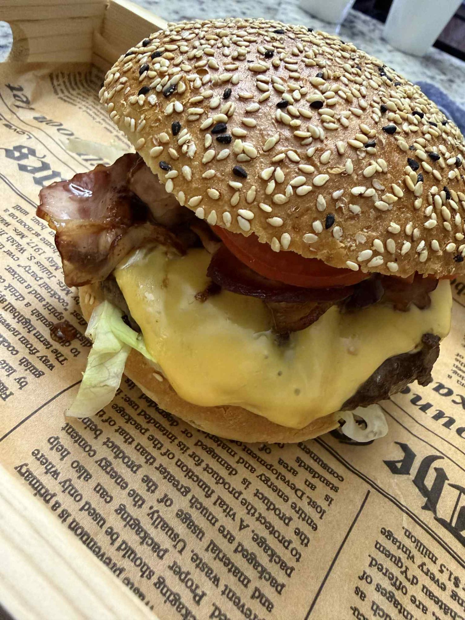 kotlet roślinny 180 g , sałata ,cebula karmelizowana, pomidor , pikle z ogórka ,ser cheddar