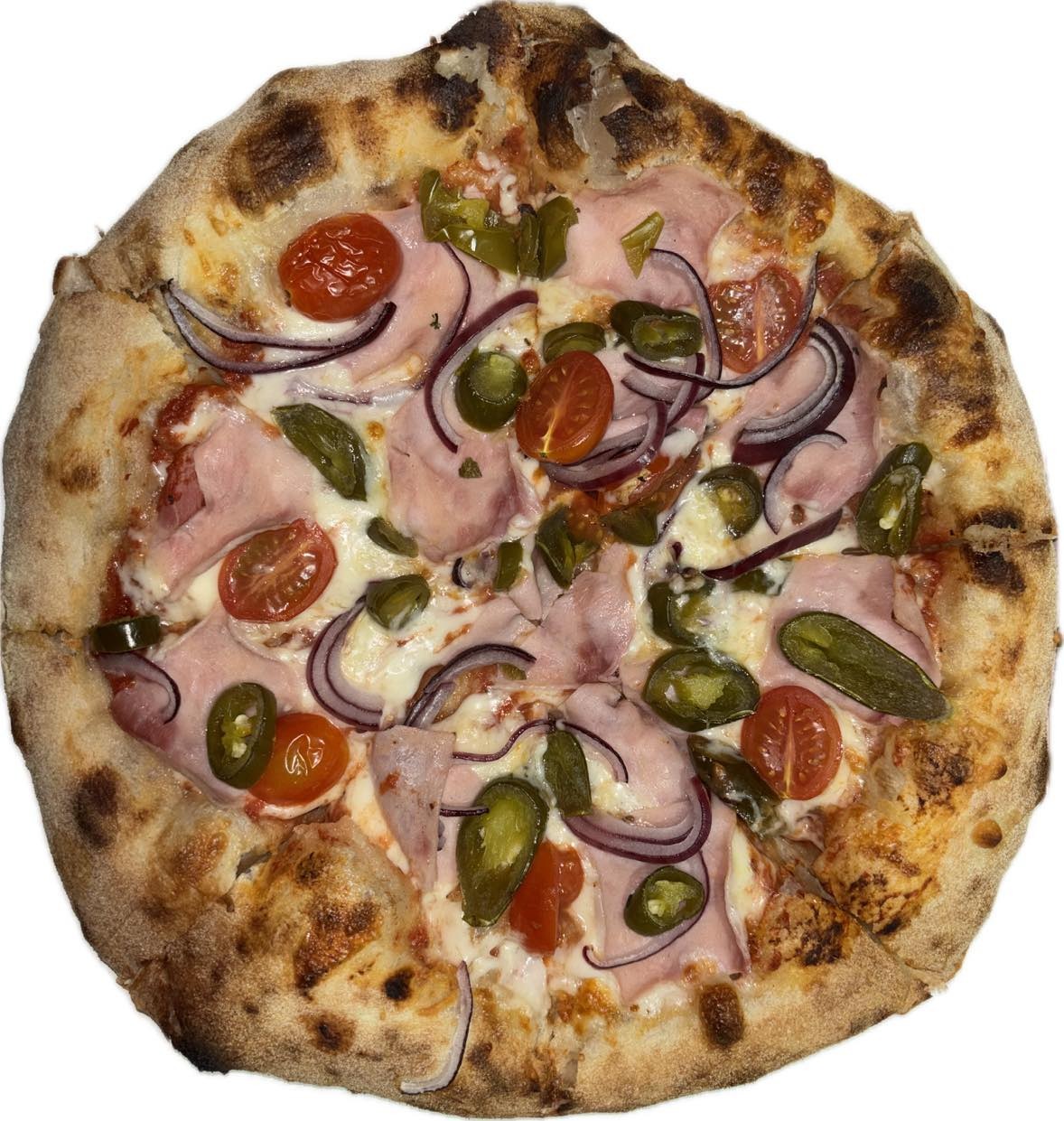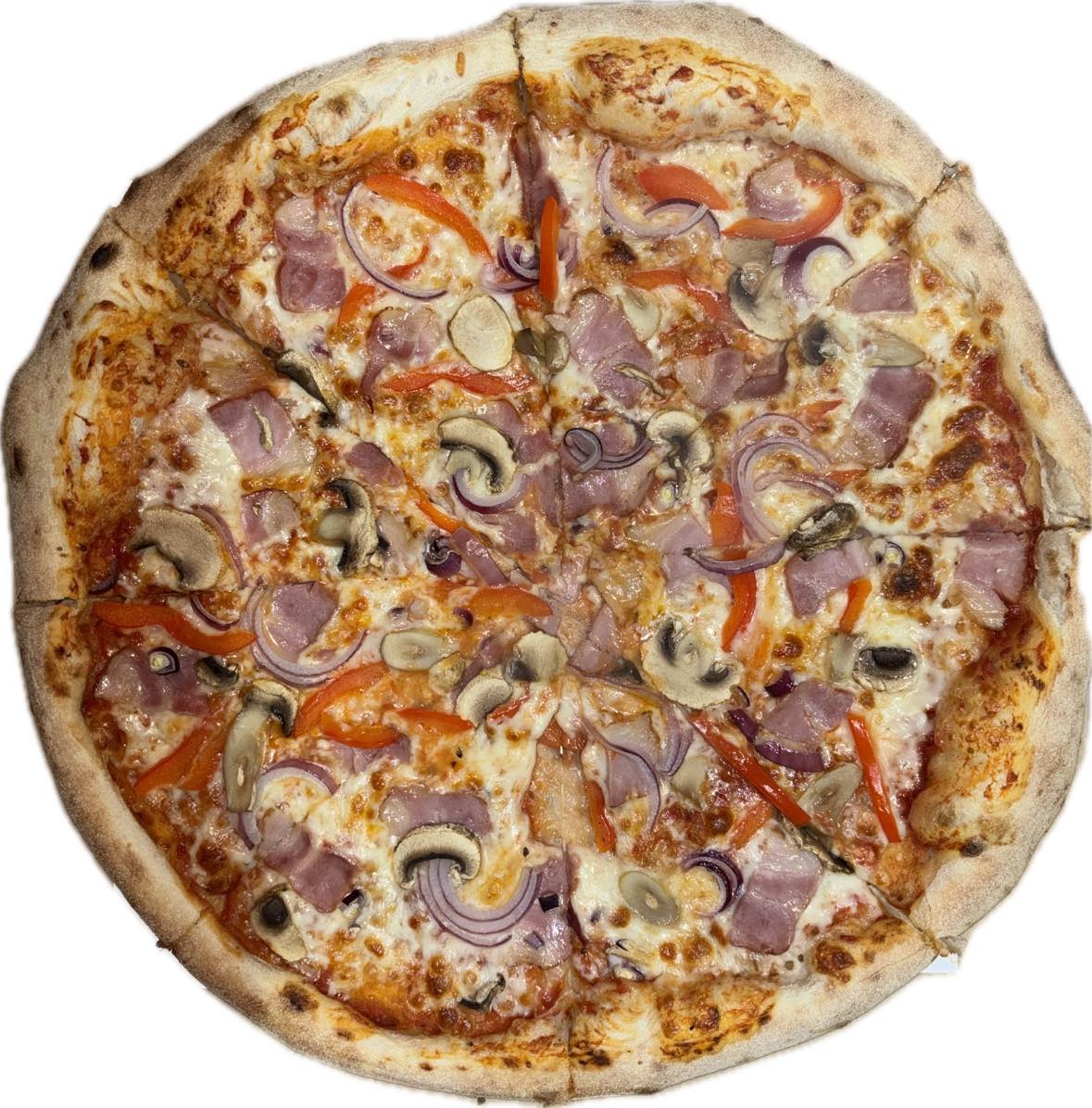 kurczak,szynka,pieczarki,cebula,jalapeno Szynka, Mozzarella Galbani, Pieczarki, Cebula, Gyros, papryczki jalapeno, Sos pomidorowy (bazowy)